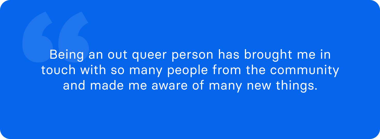Yes, being an out queer person has brought me in touch with so many people from the community and made me aware of many new things. I didn't know before that homosexuality was criminalised here in India. I’ve learned a lot, and I’m looking forward to doing more for my community.