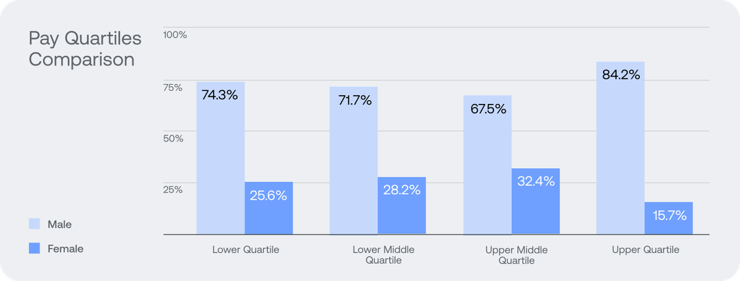 Despite the larger male representation, our Median Hourly Pay Gap shows a favourable result of -20.69% for female employees predominantly driven through representation across the lower-middle (-15.05%) and upper-middle (-65.59%) quartiles, with only a 3.63% difference within the upper quartile.