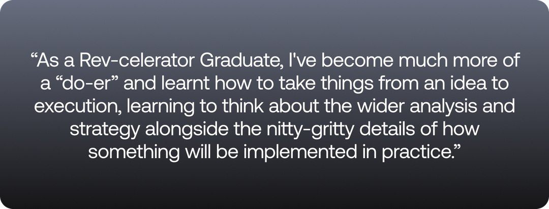 As a Rev-celerator Graduate, I've become much more of a ‘do-er’ — I’ve learnt how to take things from an idea to execution, and to think about the wider analysis and strategy alongside the nitty-gritty details of how something will be implemented in practice.