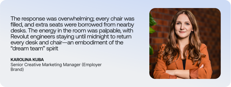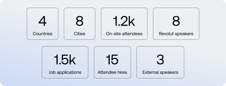 In just 2 years, RevDev has become a vibrant platform for knowledge exchange, hosting 10 impactful events that showcase the essence of our tech culture. Throughout this inspiring journey, our dedicated team of engineers, recruiters, employer branding managers, and creatives have organised record-breaking events that truly capture the spirit of technology and collaboration at Revolut. they offer exclusive tech talks, engaging networking opportunities, and a fun experience full of delicious snacks and hospitality.