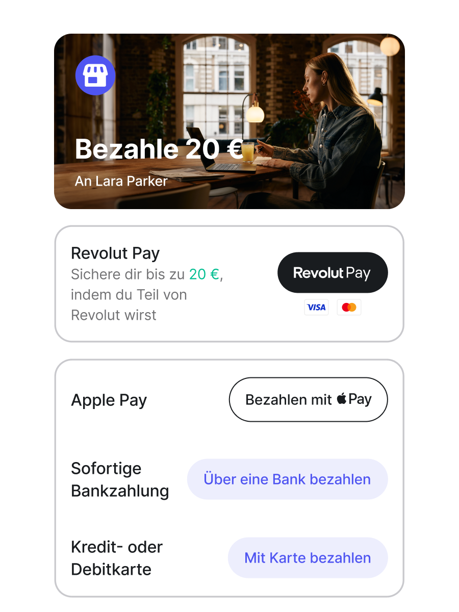 Revolut Pro bietet einfache und sofort einsatzbereite Zahlungsoptionen für die persönliche und Online-Nutzung. Du kannst damit rund um die Uhr von Kund*innen auf der ganzen Welt bezahlt werden.