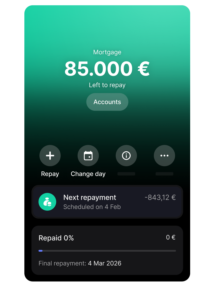 Revolut doesn’t charge administration fees for issuing loans. We also perform the property valuation for you, and cover notary and pledge registration fees. You cover insurance costs, and your initial bank may apply fees if you aren’t eligible for a simplified refinancing process.