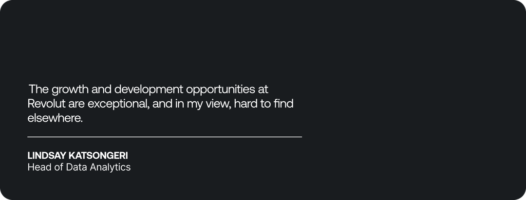 No career path looks the same at Revolut. What unites our Dream Team is the drive to learn, grow, and deliver impact at scale. In this edition, Lindsay Katsongeri, Head of Data Analytics, shares her journey, and why she believes “Revolut is like a university in itself.”