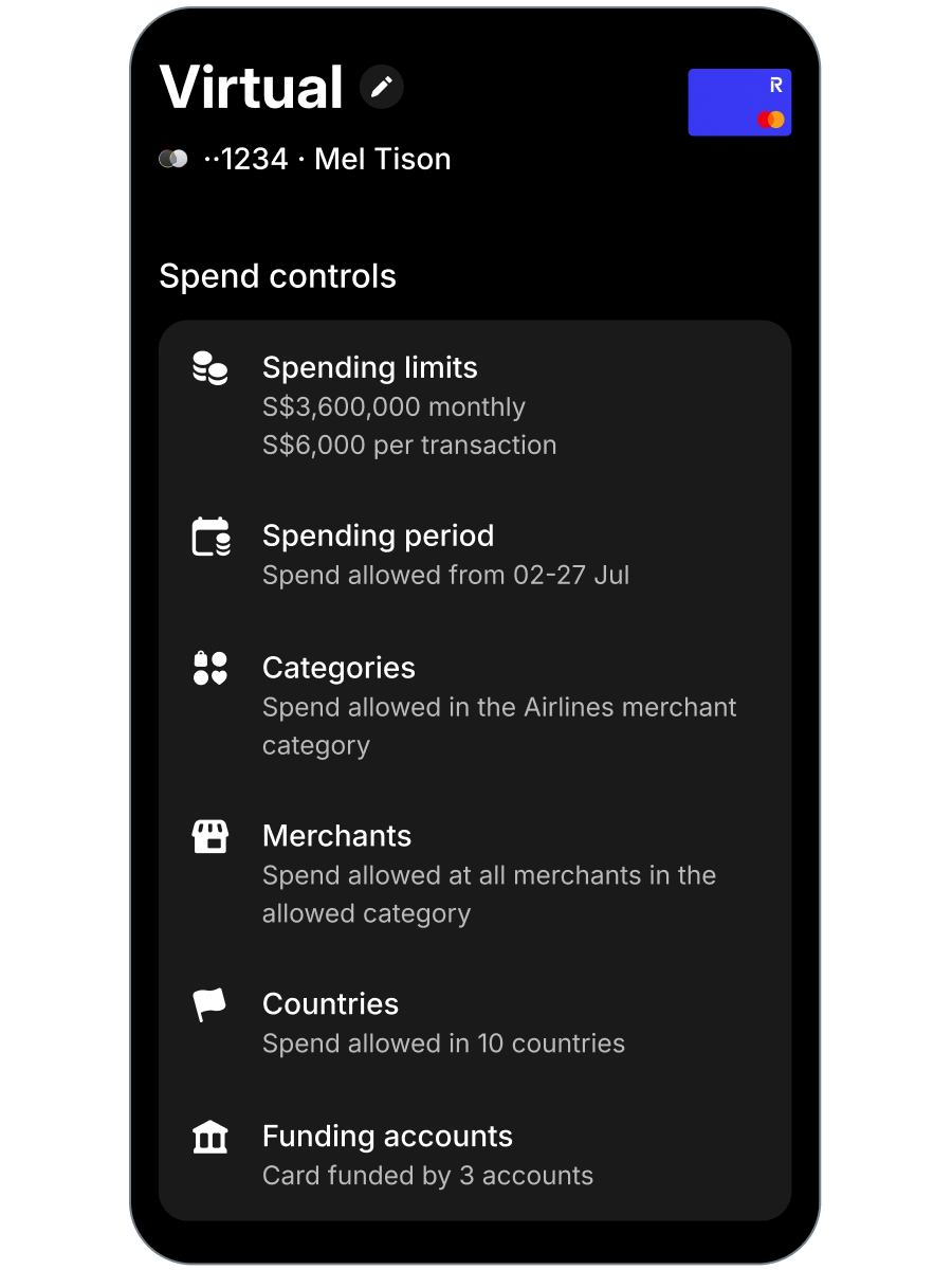 Use custom controls and spend limits on local and global card payments for full control over your spend. That’s peace of mind, built into every transaction.