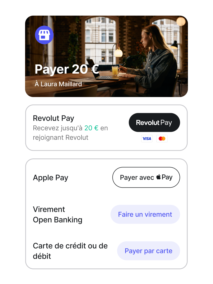 Avec Revolut Pro, vous pouvez accepter tous types de paiements, notamment par carte de débit, de crédit et via portefeuille numérique.