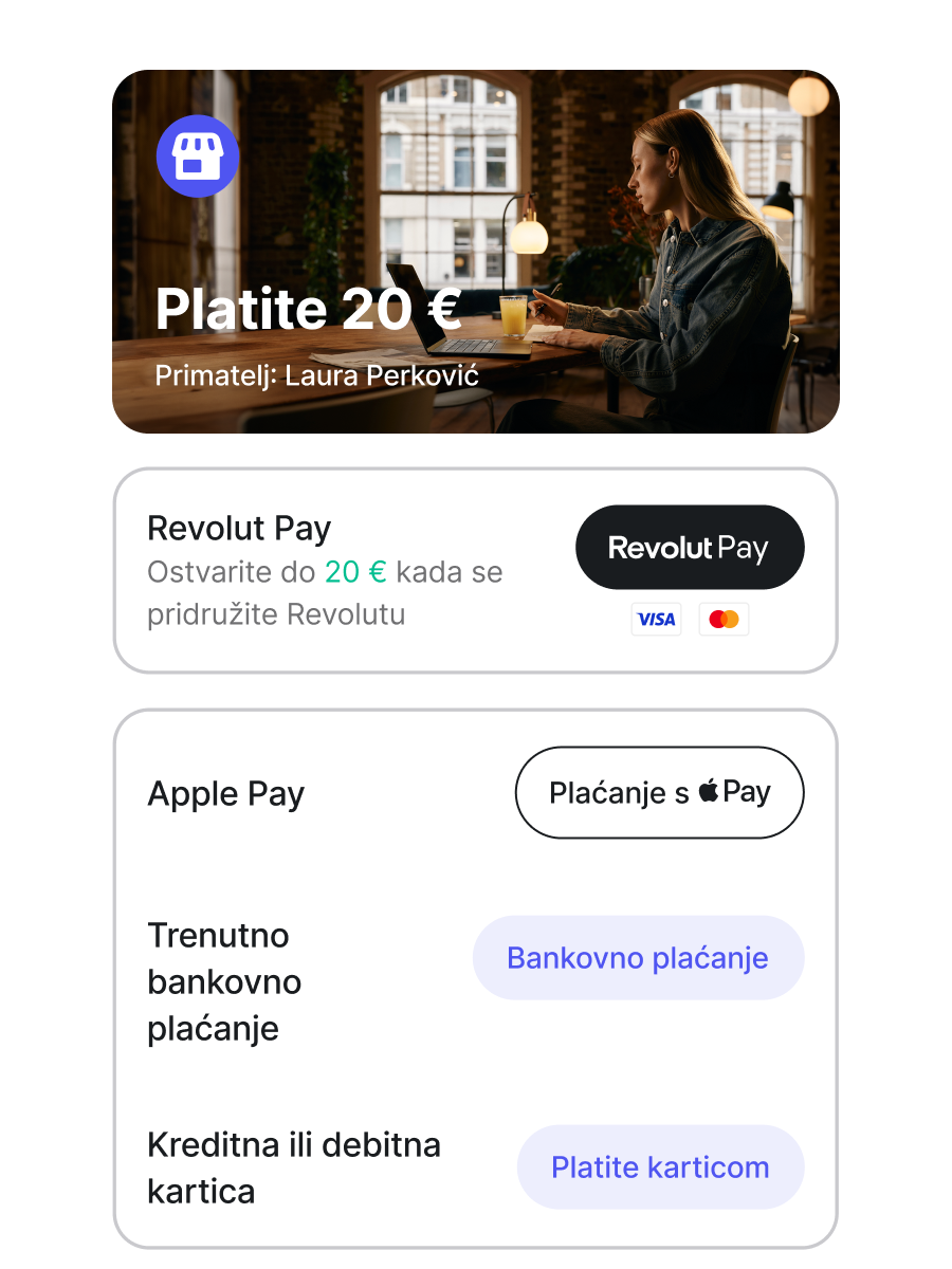 Uz Revolut Pro jednostavno zatražite plaćanja "uživo" i putem interneta slanjem linka za plaćanje. Ne trebate čak ni web-stranicu, a linkove možete poslati e-poštom, SMS porukom, putem društvenih mreža – zapravo na bilo koji način koji odaberete.