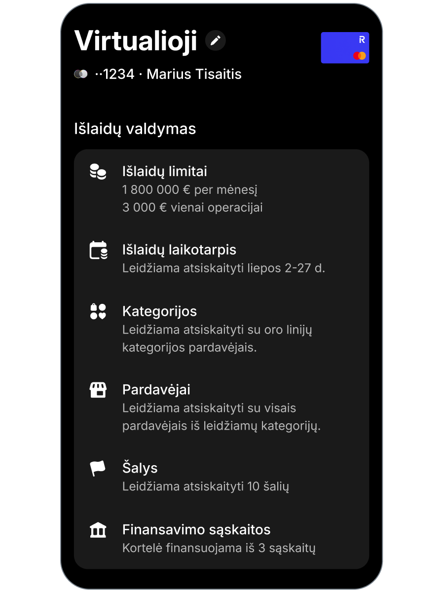 Naudok pasirinktinius valdiklius ir išlaidų limitus vietiniams ir tarptautiniams mokėjimams kortele, kad galėtum visiškai kontroliuoti savo išlaidas. Kiekvieną operaciją atlik be jokio streso.