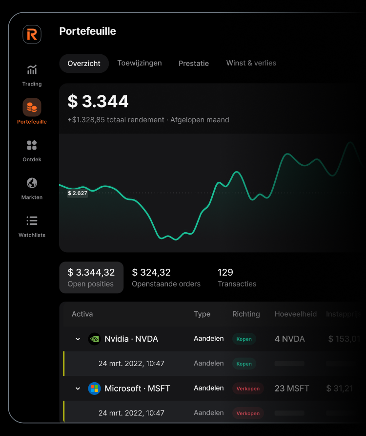 Beleggen in aandelen brengt risico's met zich mee en is mogelijk niet geschikt voor alle beleggers. Aandelenkoersen kunnen volatiel zijn en worden beïnvloed door marktomstandigheden, economische factoren en de prestaties van het bedrijf. Prestaties in het verleden zijn geen garantie voor toekomstige resultaten. Er is een risico dat je een deel van of al je belegde kapitaal verliest. Dividenden, rendementen en winsten zijn niet gegarandeerd. Fractionele aandelen hebben geen stemrecht, hebben beperkingen op de overdraagbaarheid en kunnen onderhevig zijn aan extra risico's zoals bewaarnemings- en liquiditeitsrisico's. Wanneer je belegt in effecten die zijn genoteerd in een vreemde valuta (bijvoorbeeld USD), kunnen er kosten in rekening worden gebracht bij het wisselen van je geld. Je uiteindelijke rendement is ook afhankelijk van de wisselkoers, die je rendement kan verlagen als je het geld terug omzet in je gewenste valuta. Beoordeel je financiële situatie zorgvuldig en overweeg om onafhankelijk advies in te winnen voordat je gaat beleggen. Wij geven geen beleggingsadvies. De genoemde bedrijven, inclusief prestatie- en prijstrends van de respectieve financiële instrumenten, worden alleen ter illustratie en voor informatieve doeleinden getoond.