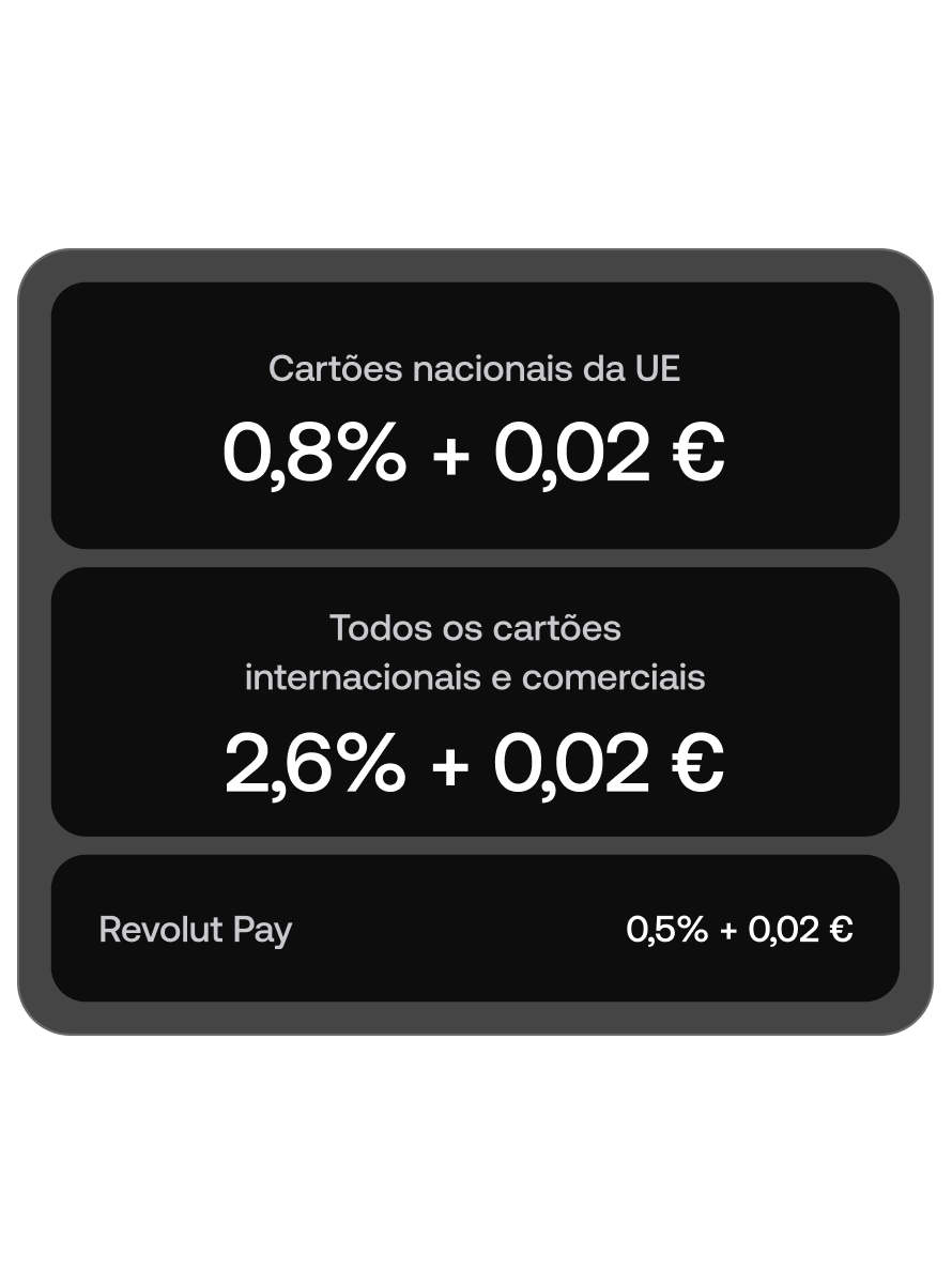 Aceite pagamentos através dos principais cartões, carteiras móveis ou Revolut Pay. Depois, veja o seu dinheiro entrar na conta dentro de 24 horas. Ao aceitar pagamentos diretamente na conta que utiliza para a gestão do seu dinheiro, facilitamos a simplificação das suas operações de vendas.