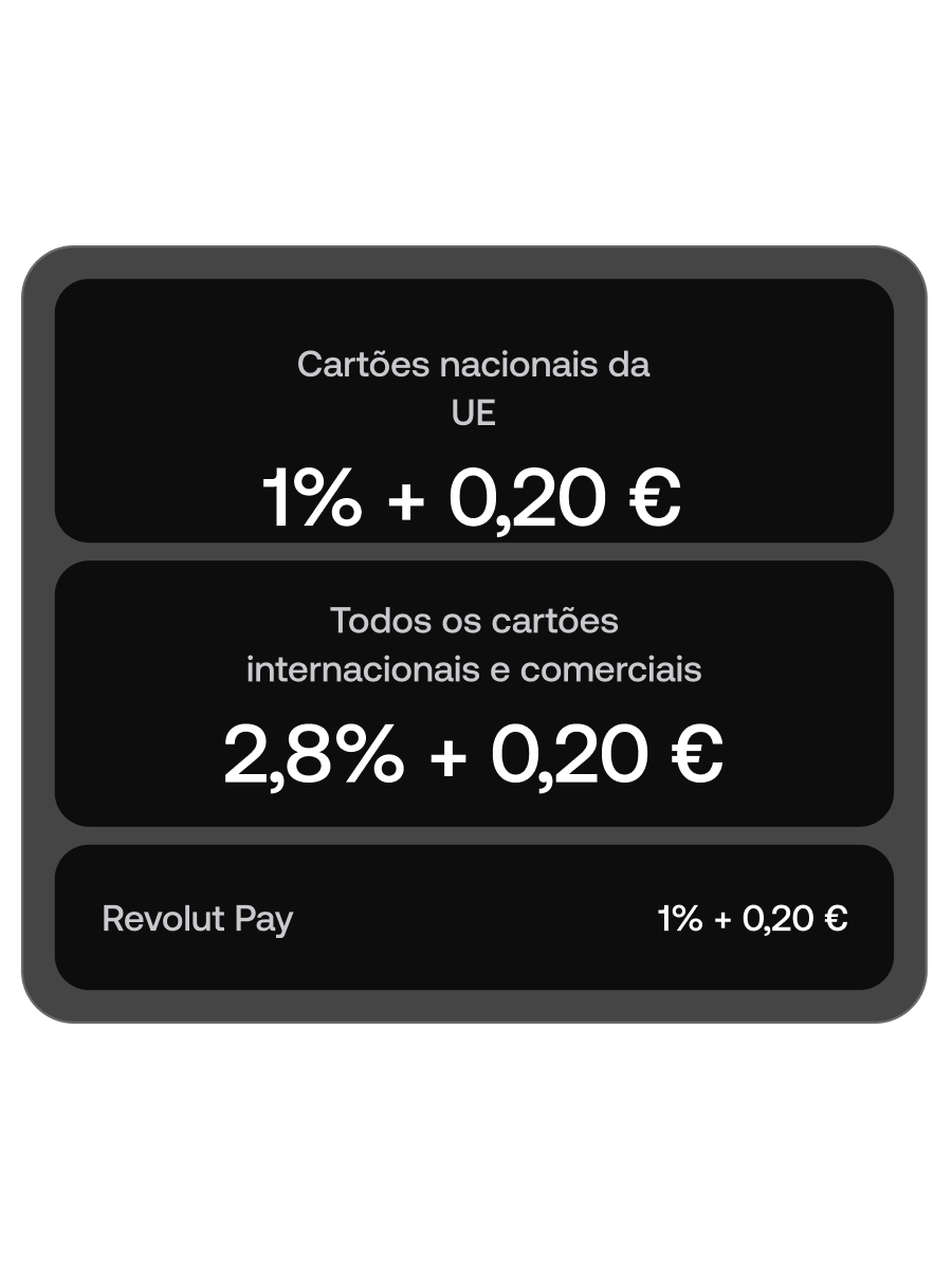Aplicam-se as comissões e os Termos e Condições da API de Comerciante da Revolut , das Ligações para Pagamento e do Gateway de Pagamento.